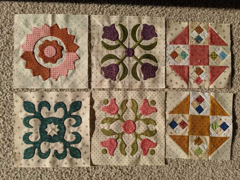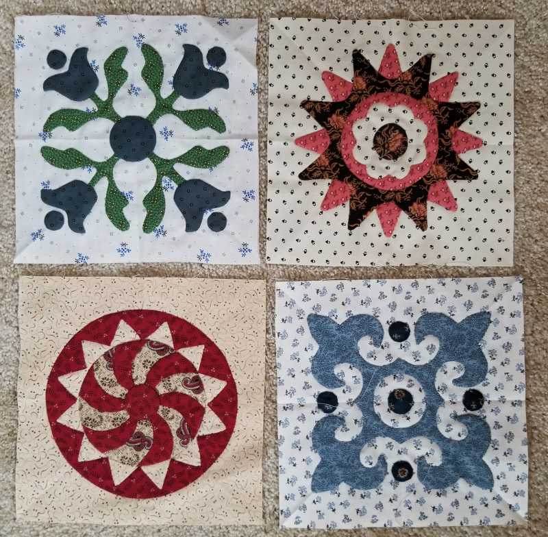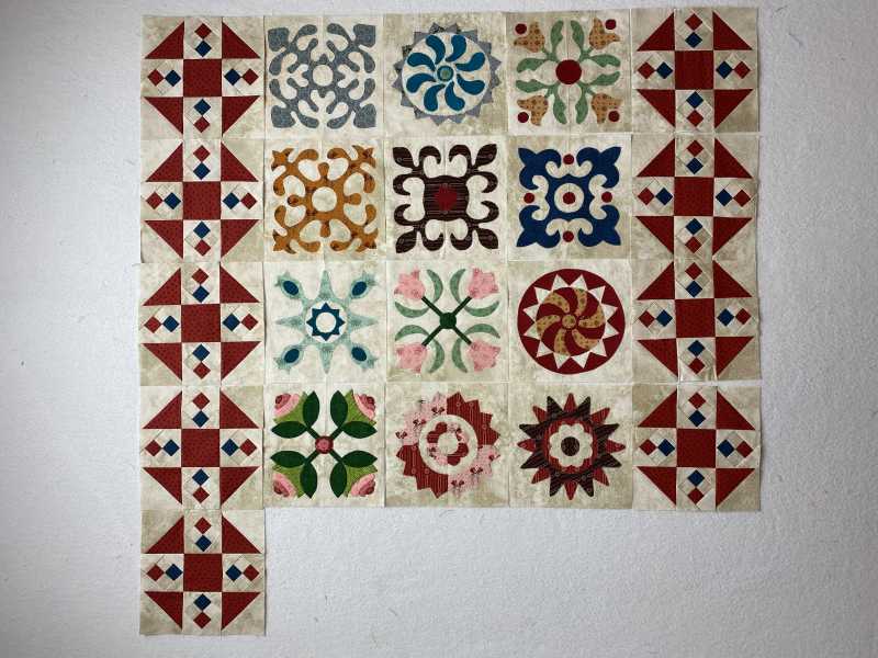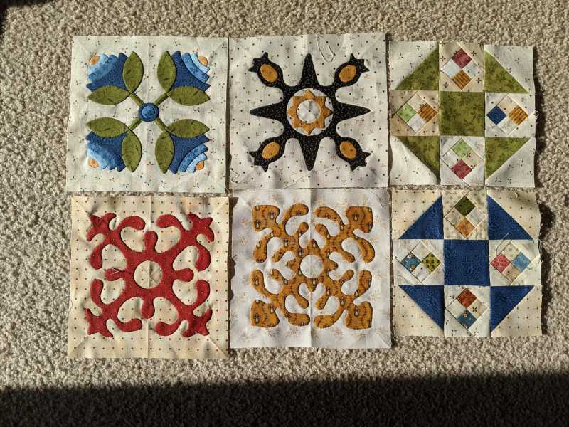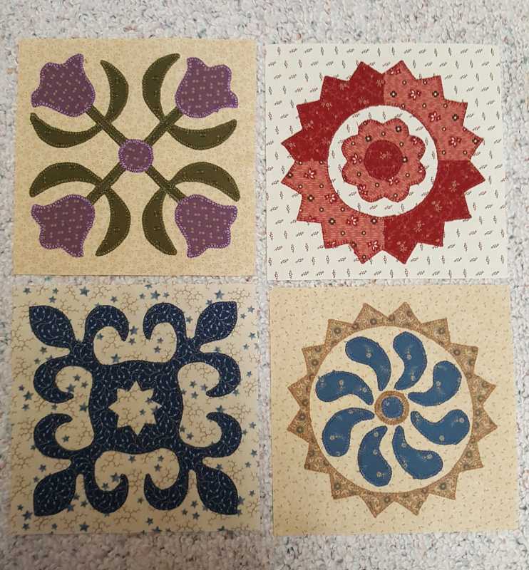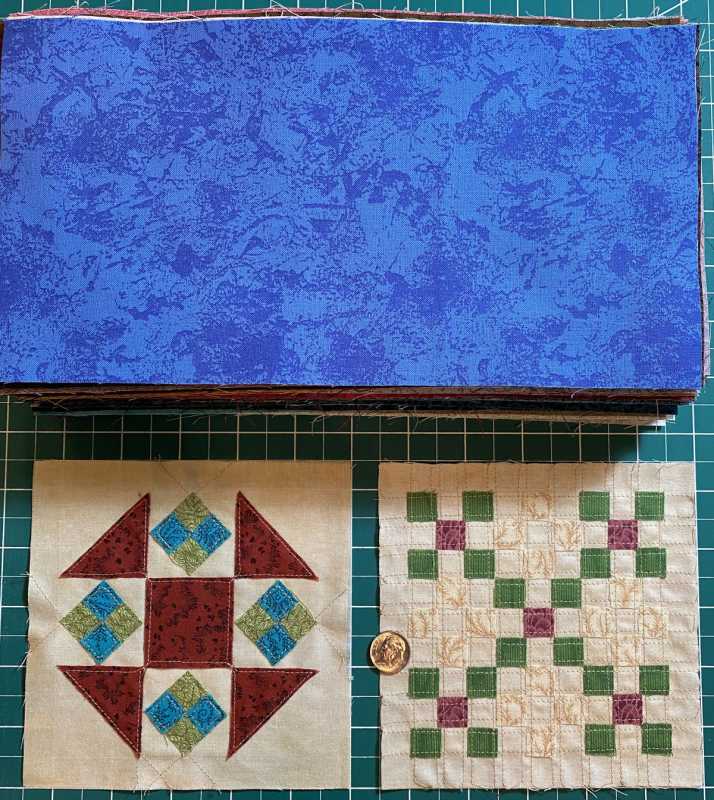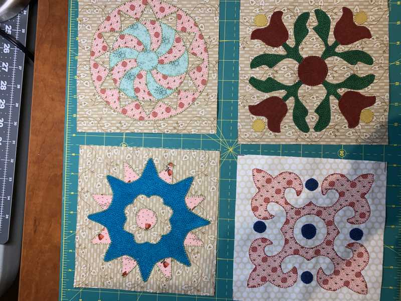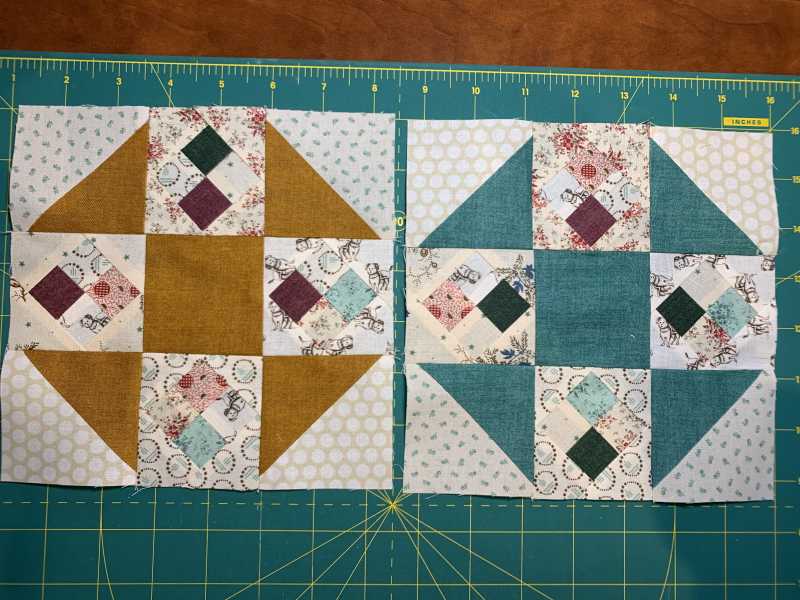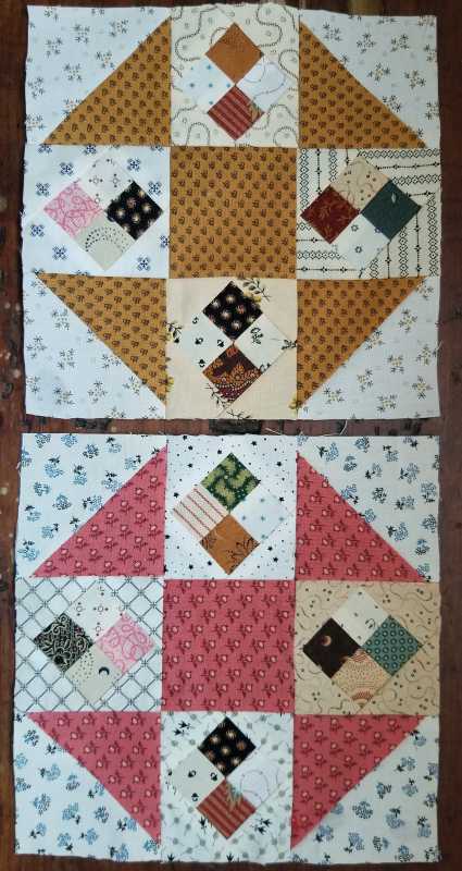 I have the perfect fabric to make this quilt but no time to make it. This is part of a fat quarter collection from Jinny Beyer that I bought a number of years ago and cut into 5 1/2" x 10 1/2" pieces. I've used it to make 2 quilts so far. There aren't enough lights for the background but I have a cream colored fabric that looks good with it. I played for a couple hours last night and made 2 blocks by just cutting squares and triangles and sewing them to a background square. The block size that will work with my fabric is 4 1/2" so the small squares are just 1/2". Not sure I will ever get to make the quilt but may turn these into coasters.