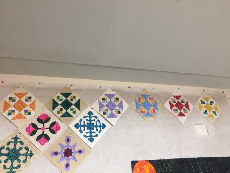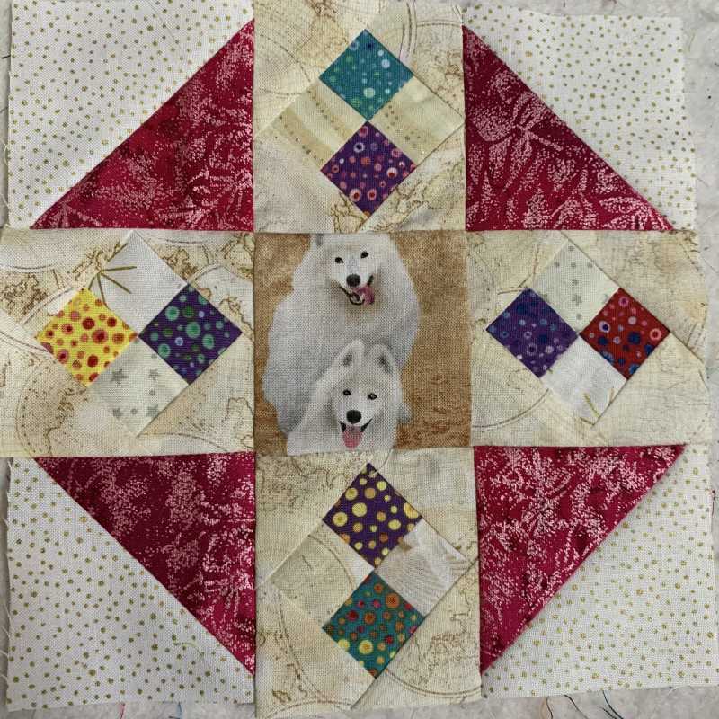 That moment when you wake up at 3 a.m. and realize that the shoo fly blocks will be on point and you just fussy cut all nine blocks to be straight on. A couple I had to rethink. But I needed to redo one block that was already finished. Needed my puppies to be represented in the quilt