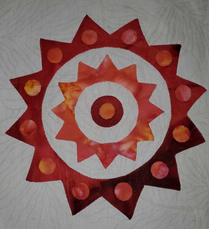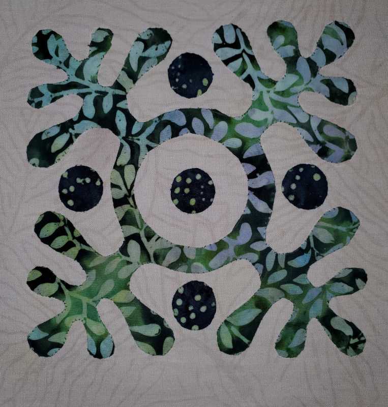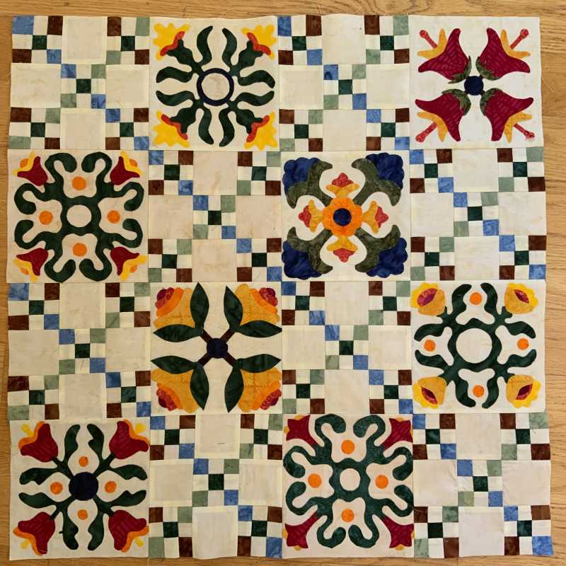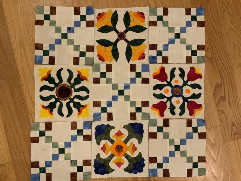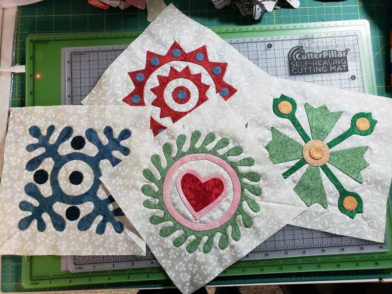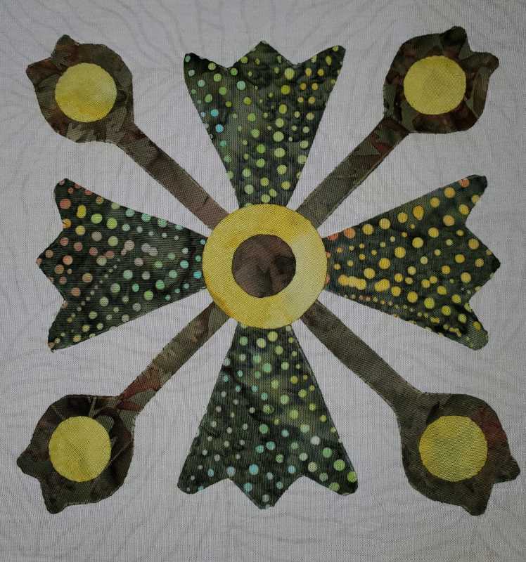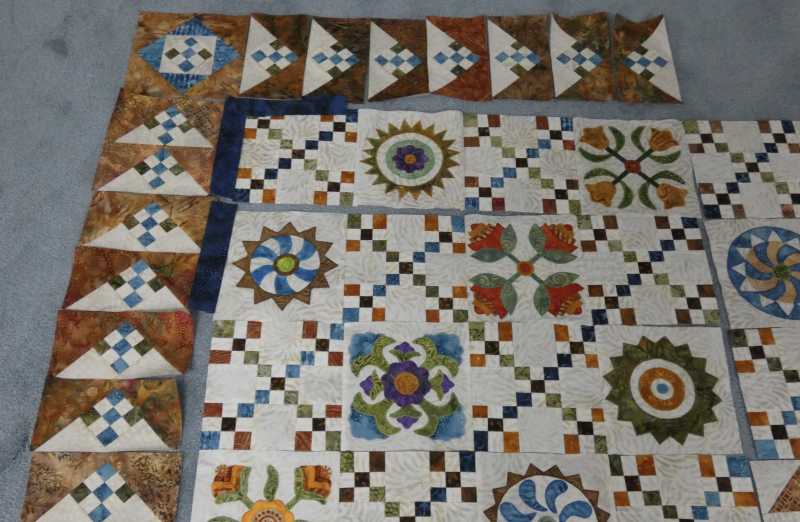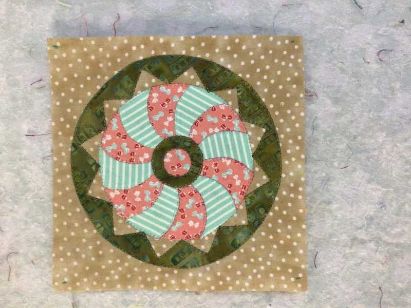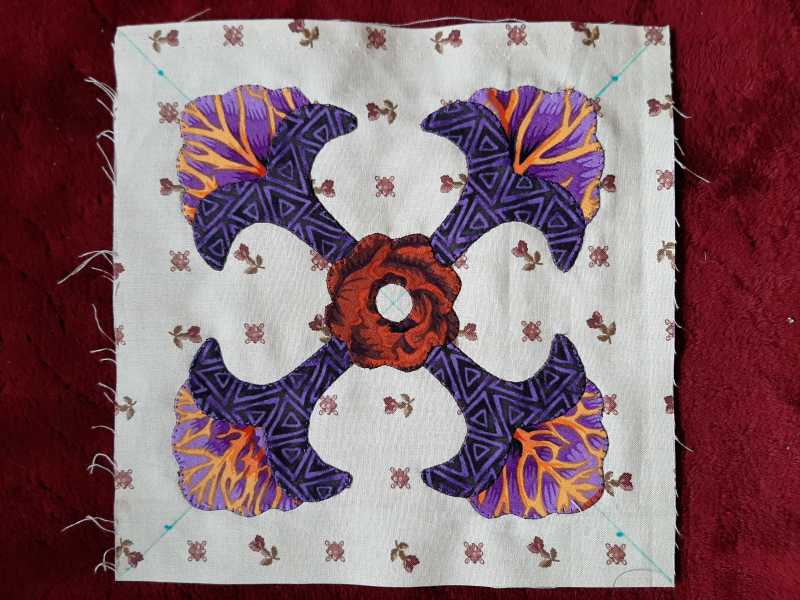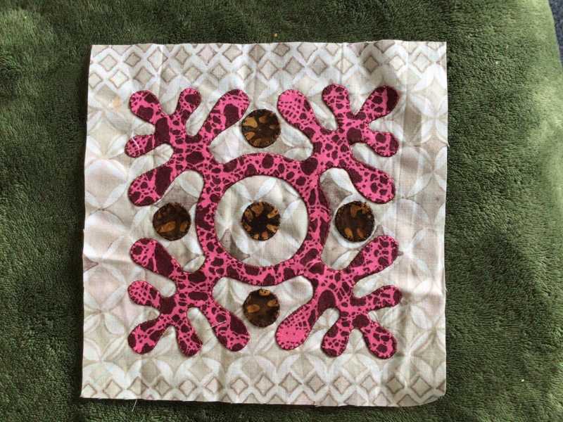I can't believe I caught up! I traced Sept. and Oct. appliques one day, chose fabrics and prepped another day, this morning I turned under edges, and I just finished the blind applique by machine. Hurray! A few days break before the November six!