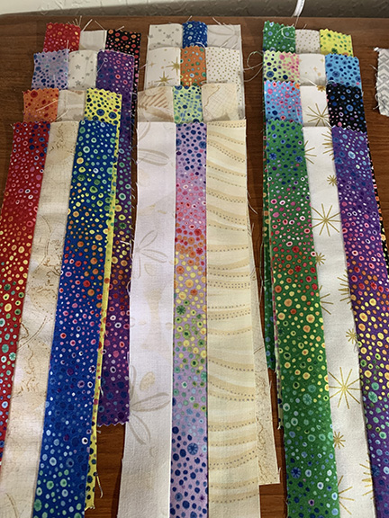 Margo gets great piecing results from saturating chunks of fabric with a 50/50 starch water solution. Allow to dry overnight, press with steam, then cut those narrow strips. The fabric is firm and stable so her piecing is very precise.