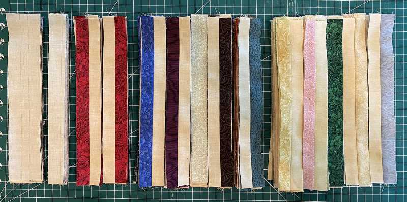 I finished assembling all of my strip sets. That was a lot of work deciding which ones went together. Scrappy is not my favorite method for piecing. Then I repeated the process layering 2 strip sets together and cross cutting using the Power Cutting method by Debbie Caffrey. That's not my usual way but I wanted to make sure I had enough width for the 5 sections and that's what worked. Then I repeated the sewing process. No pins were needed for this step, and I am a pinner. I just used my fingers to make sure the seams did not overlap which required a little stretching in places. I decided to press seams open after sewing for awhile so my first strip set sections ended up a little oversized so I made an adjustment to the positioning of the guide bars. It's not easy trimming excess width through all of those seams. Now I have 2 finished blocks to show for days of work and 240 sections ready for making 48 more blocks. I'm thinking of packaging them in sets of 5 and finishing them over a period of time. I may need to do a little sliver trimming on some of them as my first 2 blocks are 1/16" oversize. And I may need to add sashing to my quilt design so the bulky seams won't be next to other pieced blocks. This is the way I do most of my 4-patch, 9-patch, rail fence, and some other blocks, and also whole quilts with a sunshine and shadow type pattern. I like the fact that it makes mirror images which is what is needed for some of these blocks. And if I'm really careful I don't have to square up often.