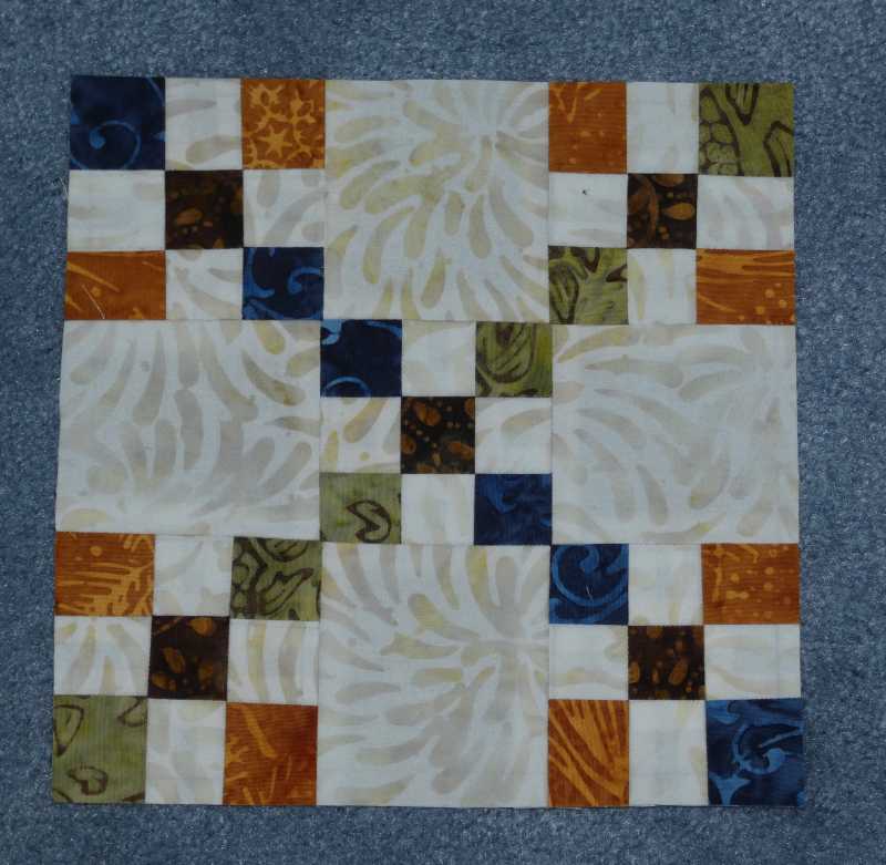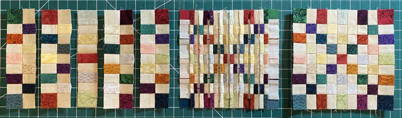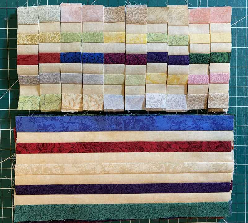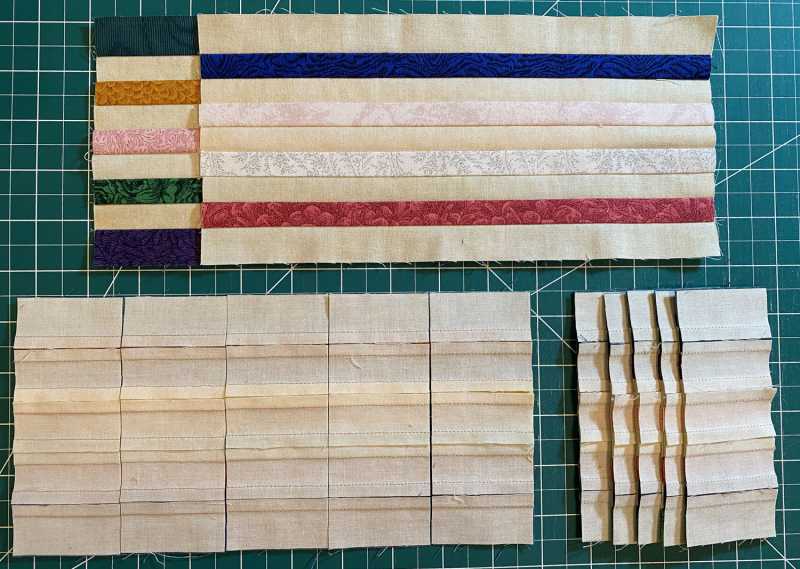 Nfiegirl, I “chunky cut” my fabrics (Sue’s instructions call for 8”x10” for these double nine patch blocks) then lay them out flat on an old beach towel. I use a 50-50 mixture of water and Sta-Flo liquid starch in a spray bottle to saturate the fabrics and leave them overnight to dry. I steam them for a crisp fabric that makes cutting and piecing a lot more accurate. I still use Barbara’s recommendations to carefully measure each step of the way. The smaller the pieces, the more important it is to be accurate!