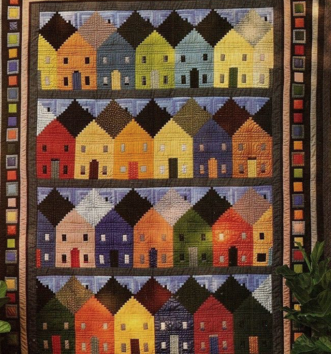 My opinion is that the houses all being solids gives the quilt a cohesive look. But, fabrics that "read" as solids, like Grunge, marbles, mottled solids, tone-on-tone, would add a bit of interest but still be part of the whole look.