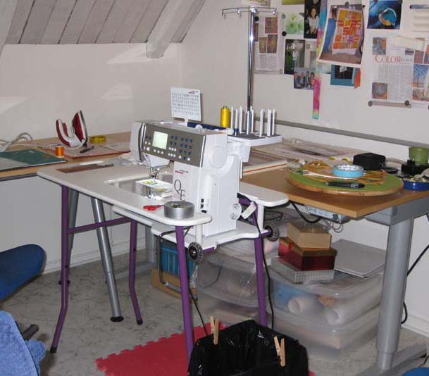I find this Horn sewing table the best for me, the back flap flips down if needed, but its great for working on any size quilt, the draws pulled out make a great extension when quilting also, two shelves hold any thing needed quickly, the machine can go up or down when needed.