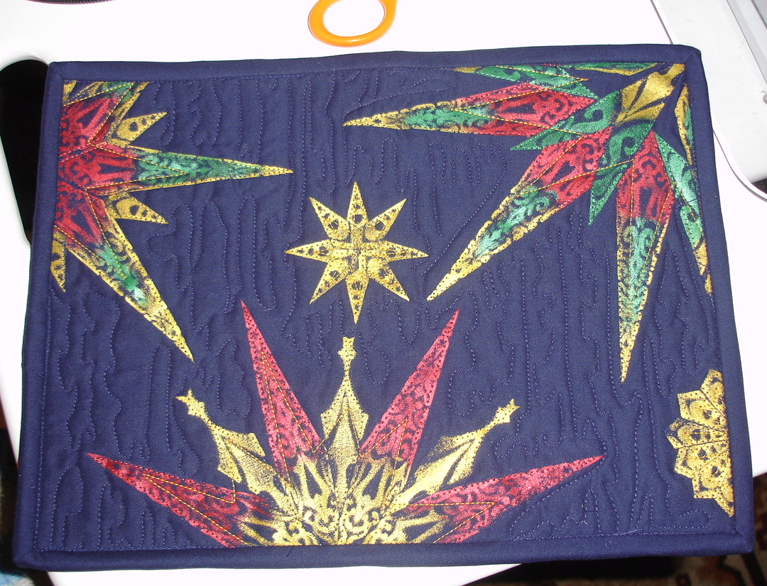 The little quilt looks like it consists of pieced kaleidoscopes. I was attracted to it, because I spent two days recently at a workshop here in the UK, piecing lots and lots of kaleidoscopes (and I'm still at it :) ). But when the little quilt arrived here I was amazed that it's actually beautifully painted and then quilted - a real gem.