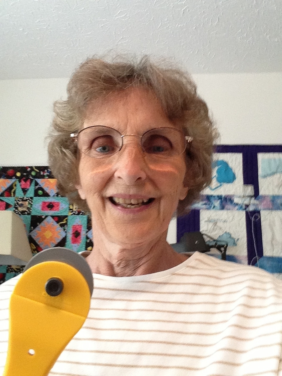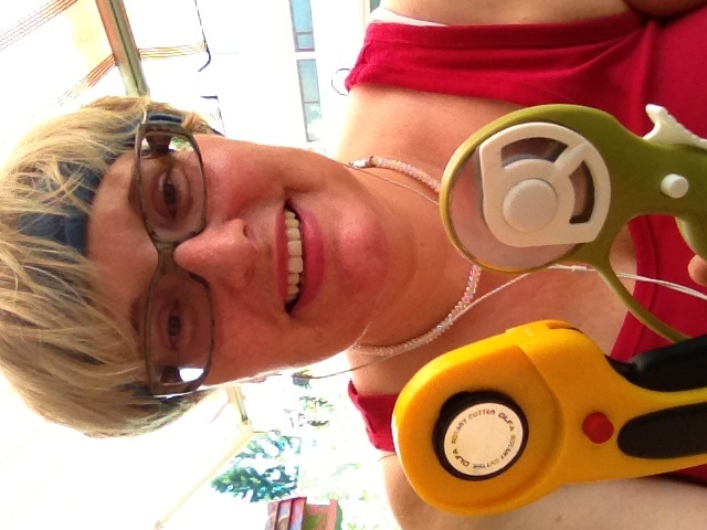 Ok, I'll play. Here's what it looks like at dawn at my house...no hair, no makeup, no caffeine, no personality, BUT a brand new rotary cutter. Two weeks ago, DH and I were exhibiting at a safety engineers' show and on the way to my booth I passed the Olfa booth. Me: Olfa has a booth at this show! DH: You mean the box cutter company? Me: NO! The rotary cutter company! Lo and behold, off to the side of all the box cutters on display, DH found a lone rotary cutter that he got for me at SAD (such a deal--how's that Margo?). Evidently the thousands of industrial hygienists & safety engineers who attended were not thinking quilting! BTW it takes a lot of nerve to appear in public looking like a psychopath!