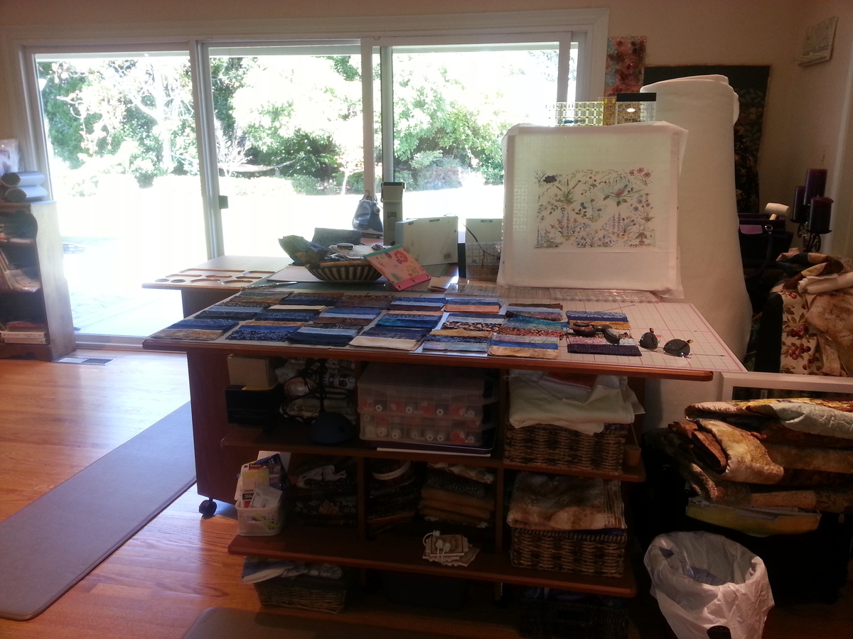 OK, I took the easy way out, and like it alot! I love re-using old items in different ways. Someone was tossing an old solid desk, which was just loose in one leg, so we tightened it and now it works. It has 3 standard drawers on the left, two on the right (one is a filing drawer), and two pull-out flat areas over each top drawer for more room. It is perfect for sewing, and I have it right next to the cutting table (used old conference 8 x 4 ft table on casters to raise it). Bookcases, old wicker chairs, old tall dresser, stained glass lightbox, all work too! An old floor lamp, 2 narrow folding tables, some lined baskets, old tins all help.