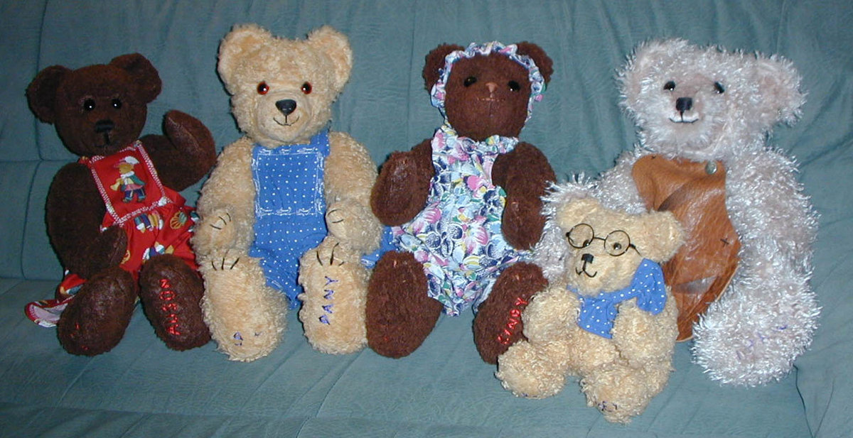 the first 5 bears i ever made, these went to my nieces & nephews in canada - and the large fuzzy one with the blacksmith's apron went to my younger brother who's a master bladesmith
