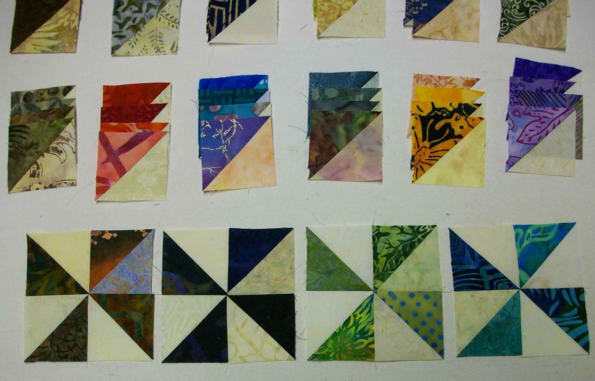 Batiks with a light on one side and a darker on the other side. The darker fabric can be dark or medium value as long as there is good contrast between the two. I have said in the past that because of the difficulty in finding cream colored batiks that you can use a tone on tone cream, white or beige fabric. I am going to change that (hope nobody out there wants to kill me) lets use a light batik and a dark--keeping in mind--high contrast.