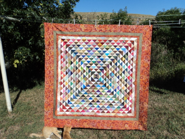 I really like the one with the red border. It is so rich looking and the border really enhances the colors of the half square triangles. It looks jewel like.
