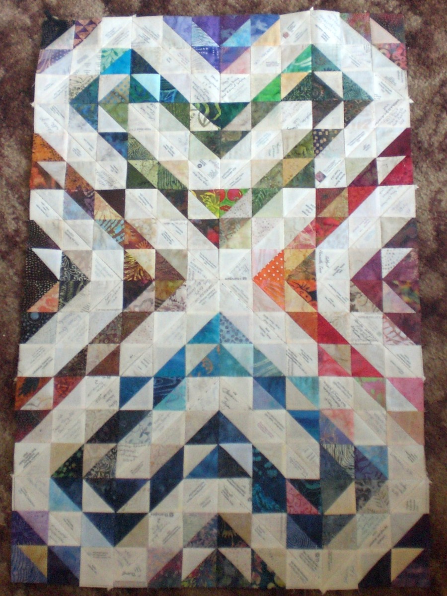 with names in order by location, with the number of names I can fit on a line. My quilt will have 52 quilting lines, with one reserved for Sisterhood of the Traveling Triangles, The Quilt Show, April 2011. If anyone wants Debbie's Excel file, she has given me the ok to forward it to you. Just e mail me and I'll send it along.