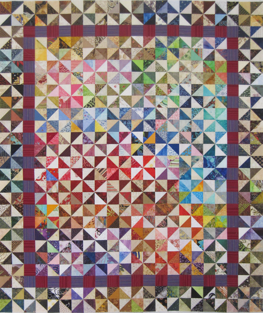 Here's my quilt top- it measures 44 x 52 inches. I tried various backgrounds and the HST' wanted to be together. When I put them up on the design wall I liked the flow of colors. Kathy