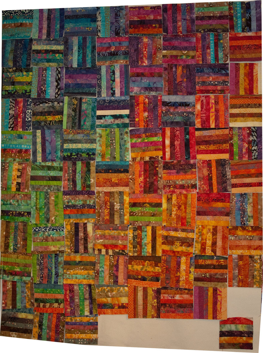 STRIPPERS top still doing; this one i've been working on steadily since we started - still have many of the blues, all the greens and the beiges to go; this is truly a quilt-on-the-go project, and i quilt wherever i've a little time and/or need to wait for something - a zip-lock bag or the little tupperware is always with me. all the strips and many of the prepared batting and backing squares are with me here in paris - ready to mark and turn into squares. apparently it's not the done thing to sit/stand behind the counter and quilt patches as i'm talking to our colleagues and customers at a cardiology congress