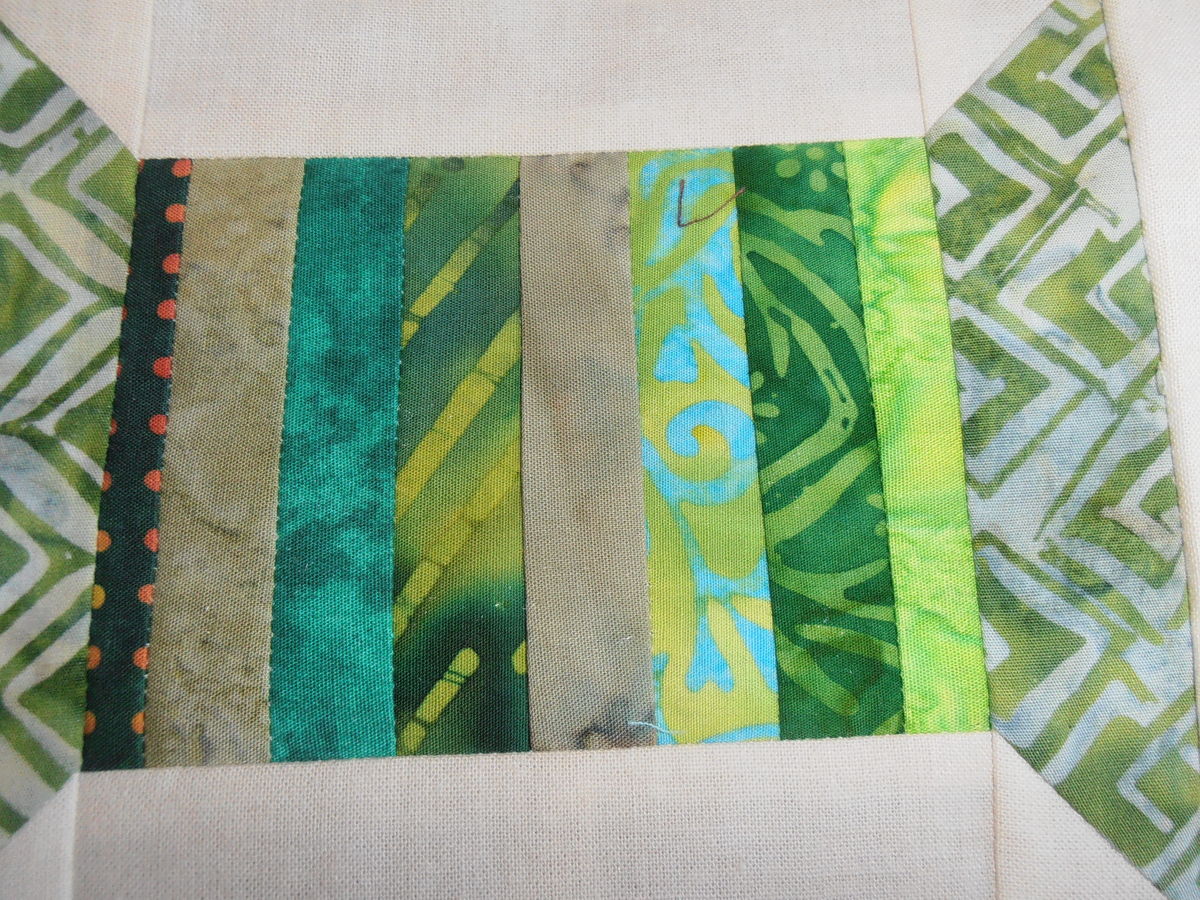 For the 1 1/2 inch X 5 1/2 inch strips used for the tops and bottoms of the reels/spools, I used various fabrics. One has bled, but this only showed up while ironing the rows together. I have ironed it each step of the way, and no sign of bleeding, and now it's going nuts on me.