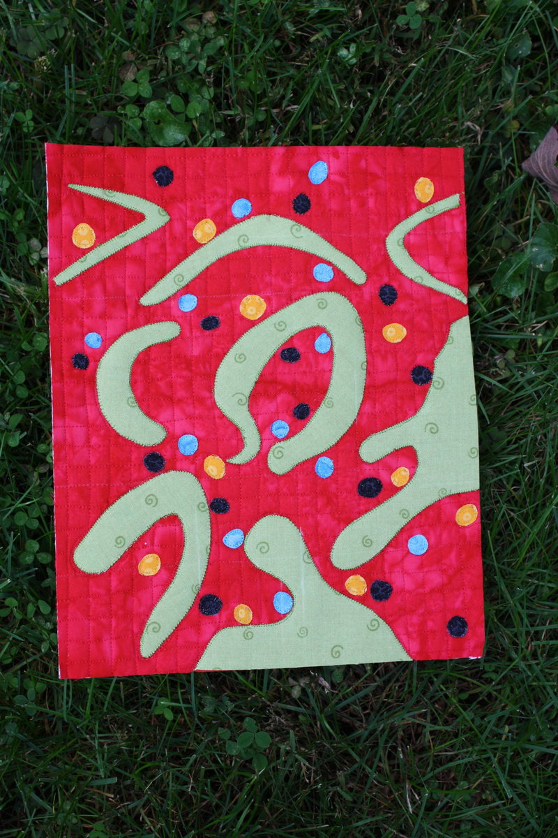 Quilt name and color were not what draw my attention. The light blue/turquoise (it's like it looks to me in my iPad), the black & white inner border and the wonky looking blocks is what I focused on. Those were the only light fabrics in a sea of medium-dark and dark colors and a resting place for the eyes. The wonky squares made me think of Lotti's swirls quilt and that's how I came about with my design.