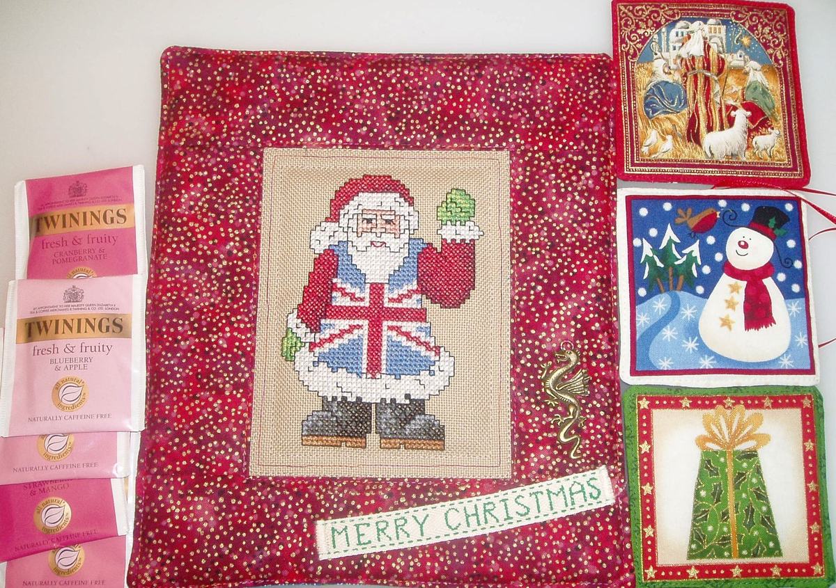Thank you, Lorchen, for the wonderful Santa, protector of dragons and presents (you can see the little dragon attached to the quilt, bottom right), and opulent ornaments with fruit teas I haven't even seen over here. Too much, you really outdid yourself but I am so happy to be able to enjoy your beautiful keepsakes during the holidays this year and beyond. Your cross-stitch work is so beautiful, the shades of color in the sleeves and boots (actually, all the gradations of color even in the smallest places) so gorgeous. I've been sitting here really admiring your beautiful gift and even more so because your heart is all over it! I didn't mention the variegated thread on the frame--going from orange to purple--where do you find such pretty threads, Lorchen? Among other greetings, I noticed the Japanese