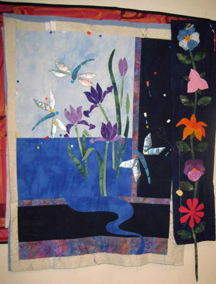 The wall hanging on the design wall was for my daughter. She loves dragonflies and I thought it would be a nice present for her birthday in July. After my Indigo exhibition she asked me for “The Hearts of the Matter” wall hanging for her birthday. It never even occurred to me she would like one of my Indigo pieces instead (which I wanted to keep myself, so am going to have to make myself another one). Now, instead of finishing it, it is on the design wall waiting to be finished, but I will do it sometime but no rush now.