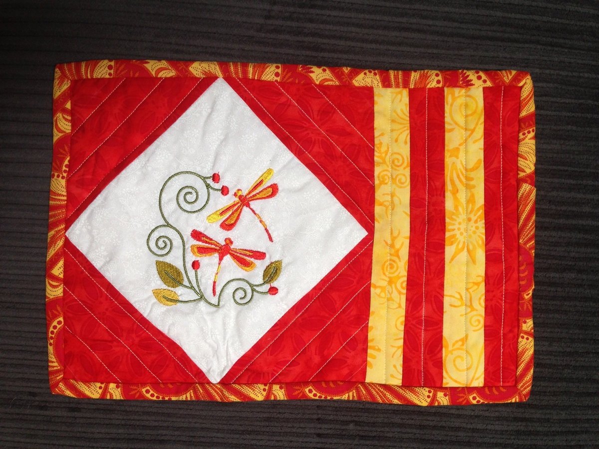 I got a gorgeous mug rug from Vicki. Love the colors and dragonflies! Thanks a lot (sent you an e-mail a couple of days ago) and sorry it took so long to post and let you know I received it.