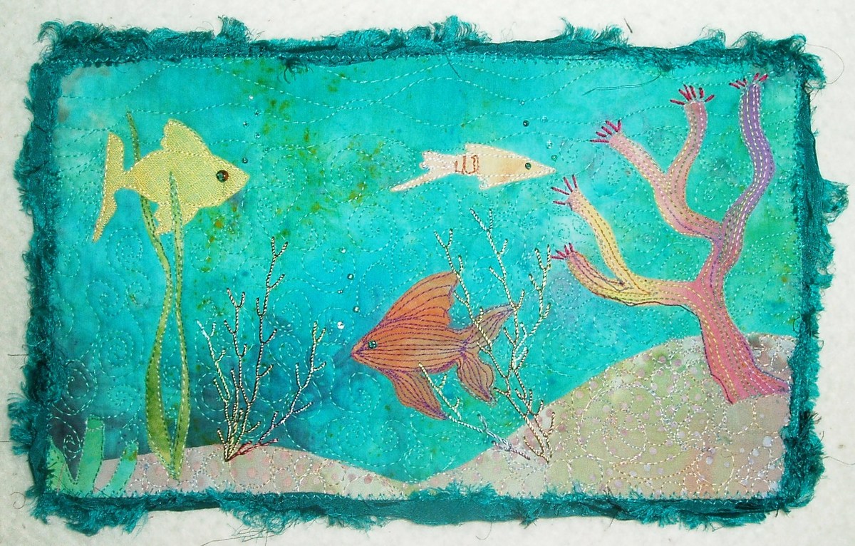 Then came BJ's machine embroidered mug rug with beautiful colors and Asian design. The border was tacked down with a lovely decorative stitch (will have to remember to try that sometime