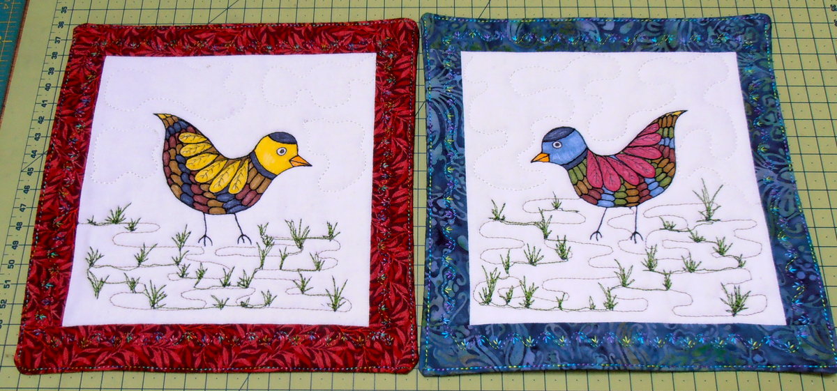 I made these mug rugs for my parents for their birthdays and gave them to them today. I drew and coloured the birds using Pitt pens and then stitched around all the details - except the eyes! I used Ricky's fast finish method instead of a binding. He demo's it in the episode with Sally Ducto.