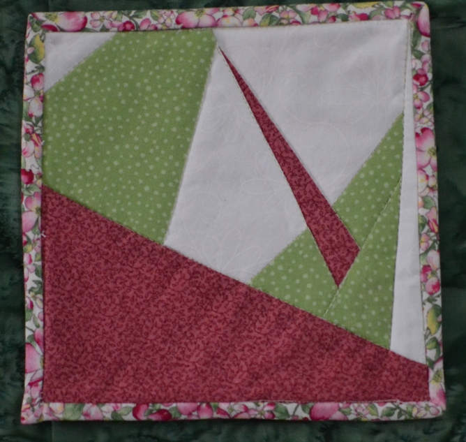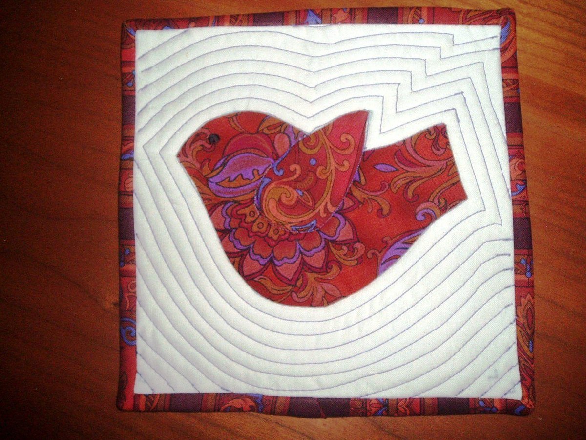Here's my lovely mug rug from Terrie (which I've already enjoyed with a cappuccino!). As you can see, the colors are beautiful and the echo quilting so perfect. If you could only see the stitching down of the applique (that is so perfect too). Don't let Terrie fool you... her work is beautiful and she is no novice!