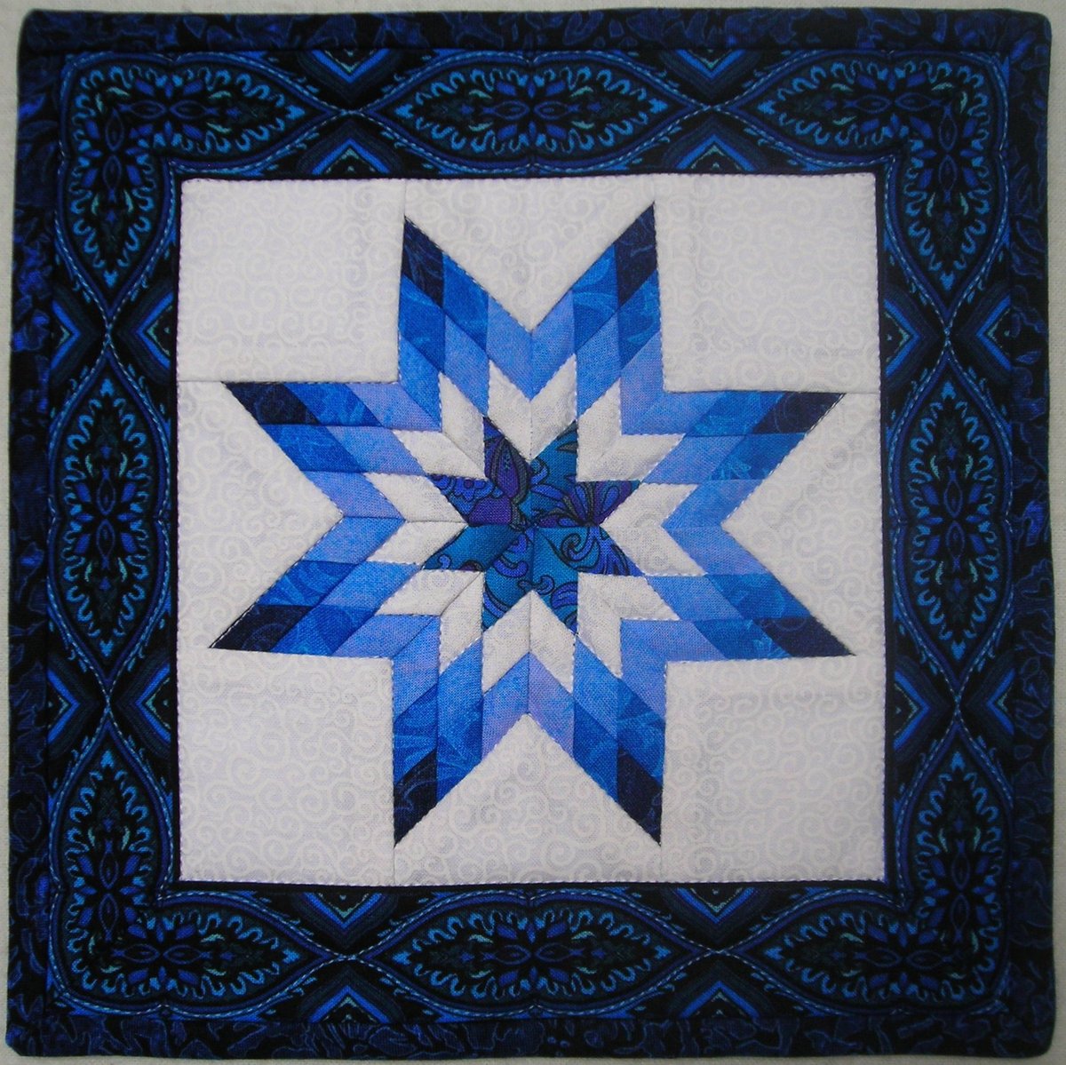 Well, I know you may not know this about me but my favorite color is blue so I was really pleased when my newest mug rug arrived. Just returned from vacation to see the beautiful muggie from Andree. I love the border and the precision of the mitered corners. Thank you Andree--well done.