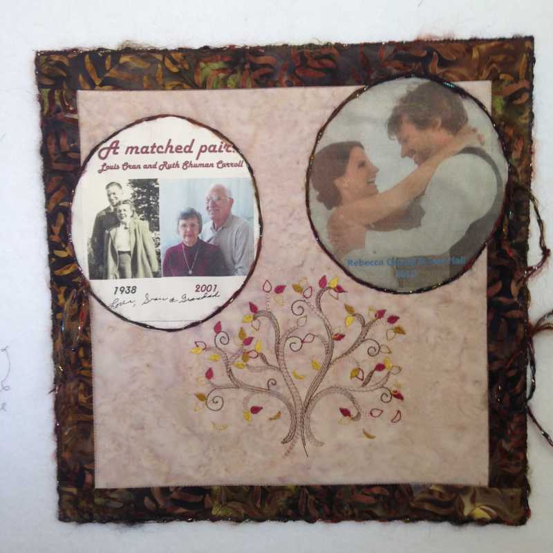 In any case, here it is. Not the most artistic mug rug I've made, but it's very special. Several years ago I had my mother in law sign these pictures of her and Grandad thinking that I would use them for the grandkids when they got married. Both Gran and Grandad have passed away. When the topic "Roots" came up, I knew this would fit. Then I remembered I had 4 embroidered trees that I didn't use as planned. Viola! It all came together. I mailed it off to my niece, however I haven't heard anything back yet....