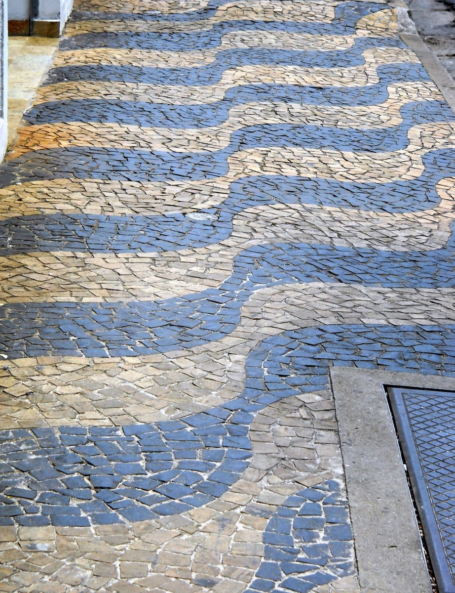 The back is a print that is a very famous cobble stone sidewalk pattern throughout Brazil, most famously used along the beach at Copacabana, but used in most cities in Brazil.