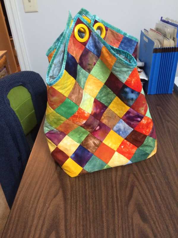 It's October 3rd, almost time for me to jump into bed, but I figured I'd better admit to the group, I don't have a 'roots' piece to show you. I had great ideas, but somewhere along the way, I got sidetracked and it became the Mondo tote! What I wanted was for each side of that thing to represent a 'root' vegetable! I picked out the fabrics for my beets, carrots, radishes, etc. a little sky and some greens for the tops. As I started to put those 2 1/2" squares on the foundation, I realized that this thing! Gets sewed together with diagonal lines. Well, at that point, the whole idea went underground and the best I can say is, maybe I can carry my 'root' crops home from the market in it.