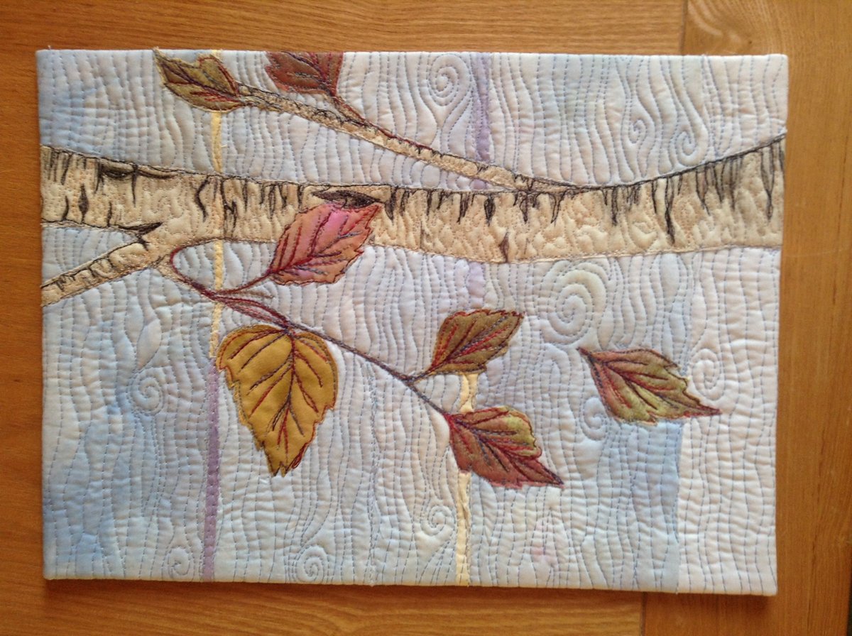 It's raw edge appliqué with the leaves (except 2) printed on some hand dye cotton with metallic paint then cut round leaf shape and bondawebbed on. The stitched branch bunched the fabric so I had to cut a section out