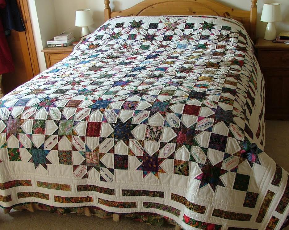 The quilt will be set up with freezer-papered backs and set into a temporary scrapbooks. They guests will sign their names. one on each square and I'll put it together with other squares after the wedding. I'm doing it in Kaffe Fasset and batiks in purple/fucshia colourway.