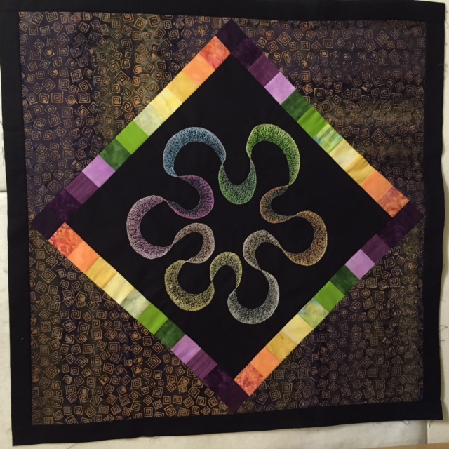 Okay, so I am a day late and a dollar short but this is what I have so far. This is my second attempt at a Libby Lehman challenge quilt. The first one died when I managed to melt my perfect satin stitching around an appliquéd circle with the iron. I still have to quilt this one but as that will probably take me the rest of the month I thought I would show and tell now.