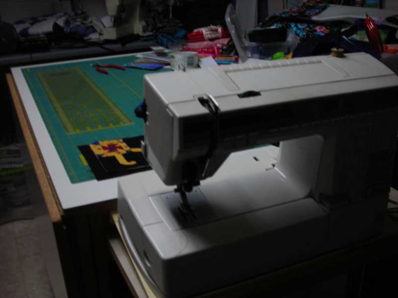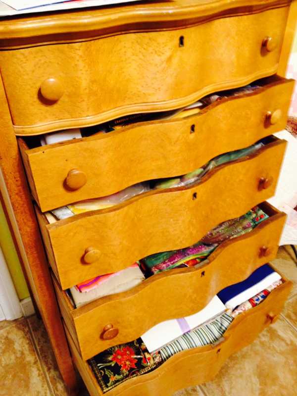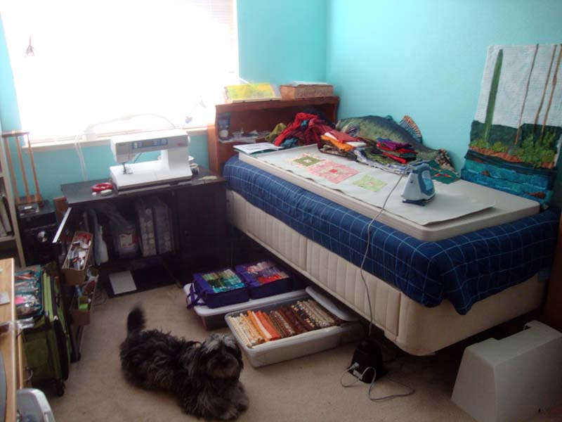son's sewing room. The bed is on risers and a table is on top making a good counter height to iron and cut fabric. Wad of fabric in corner waiting to be ironed and put away. I washed my entire stash and just folded most of it without ironing, but this fabric came out very wrinkled (Kaffe Fasset's shot cotton, very pretty colors).