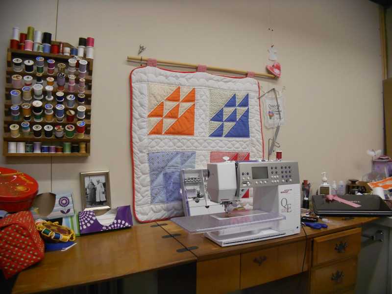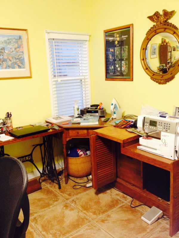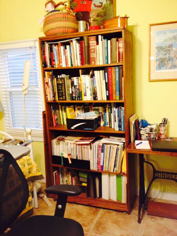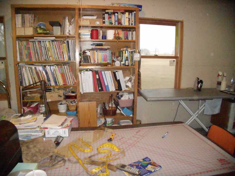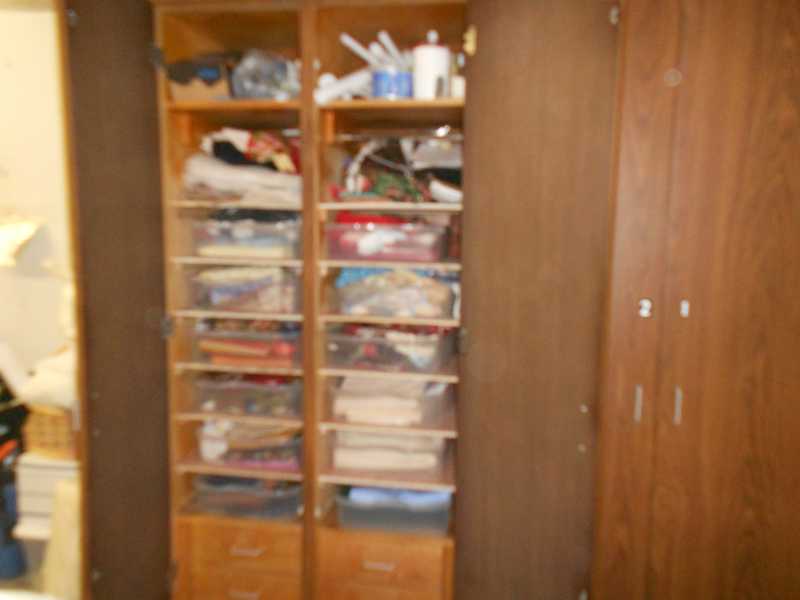 On the opposite wall is the desk and bookcases. Two shelves remain as reminder of son, the shelf under those have two bins for magazines, books and patterns. Bookcase on the other side has plastic bins for more fabric storage. Couldn't use the closet, because it is stuffed with son's stuff. I imagine when he gets a permanent station, he will take most of it (a lot of camping and backpacking gear). Hung a length of white flannel over closet as a design wall.