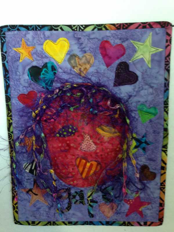 Now for my self portrait. Just since our move to Washington state my hair turned curly and I no longer had a job. So things are different for me in a good way. My self portrait signifies my new hair, the love of my husband and children and my love of quilting, friends, and life in general. Purple is my favorite color and my mouth is a tilted heart because I always try to speak with love and/or humor.It was fun to make, once I got out of the way of myself! Thanks Rita for challenging us.