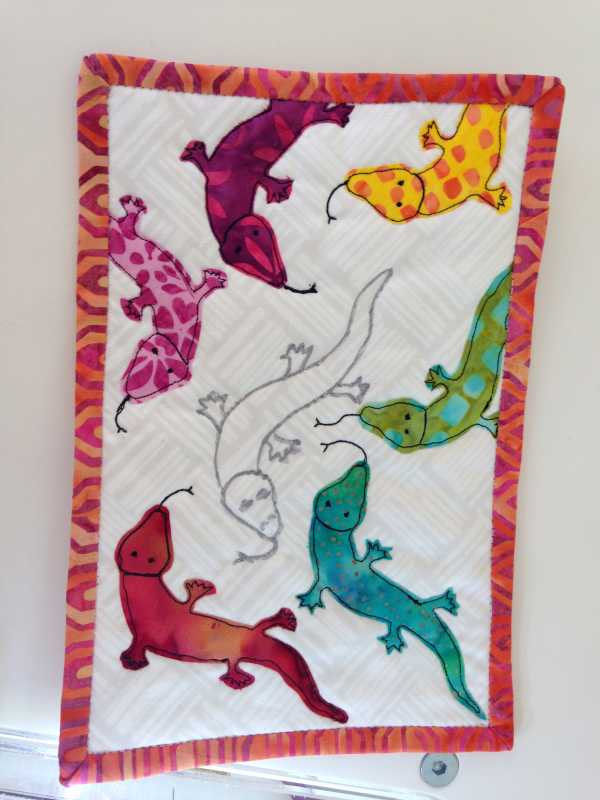 The trick with a two sided mug rug, is how to quilt it! So I quilted the lizard side onto the batting first, in only the lizard area. Then marked out the lizard area on the lettered side, and quilting the rest. Hard to explain, but it worked pretty good. I had fun with this, learned a few things with my new machine, and actually made something in a weekend!