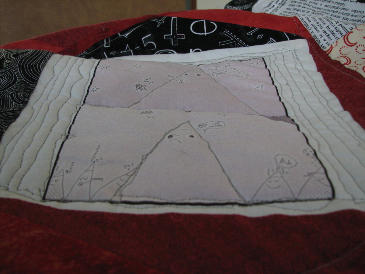 I *think* the FMQ won't be bad since it is small sections, lots of times. In other words, outline one comic (5x7 area), then the next, then the next. We'll see; pivoting all that bulk to do those small squares sounds dreadful!