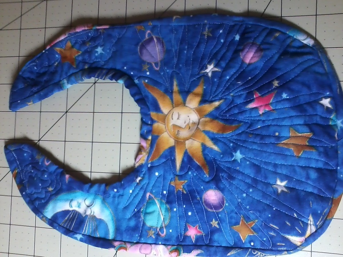Jan, I love the placement of the sun and moon--everything else revolves so nicely around it. I'm sure you'll find a good solution for the neck. The quilting fits the bib perfectly.