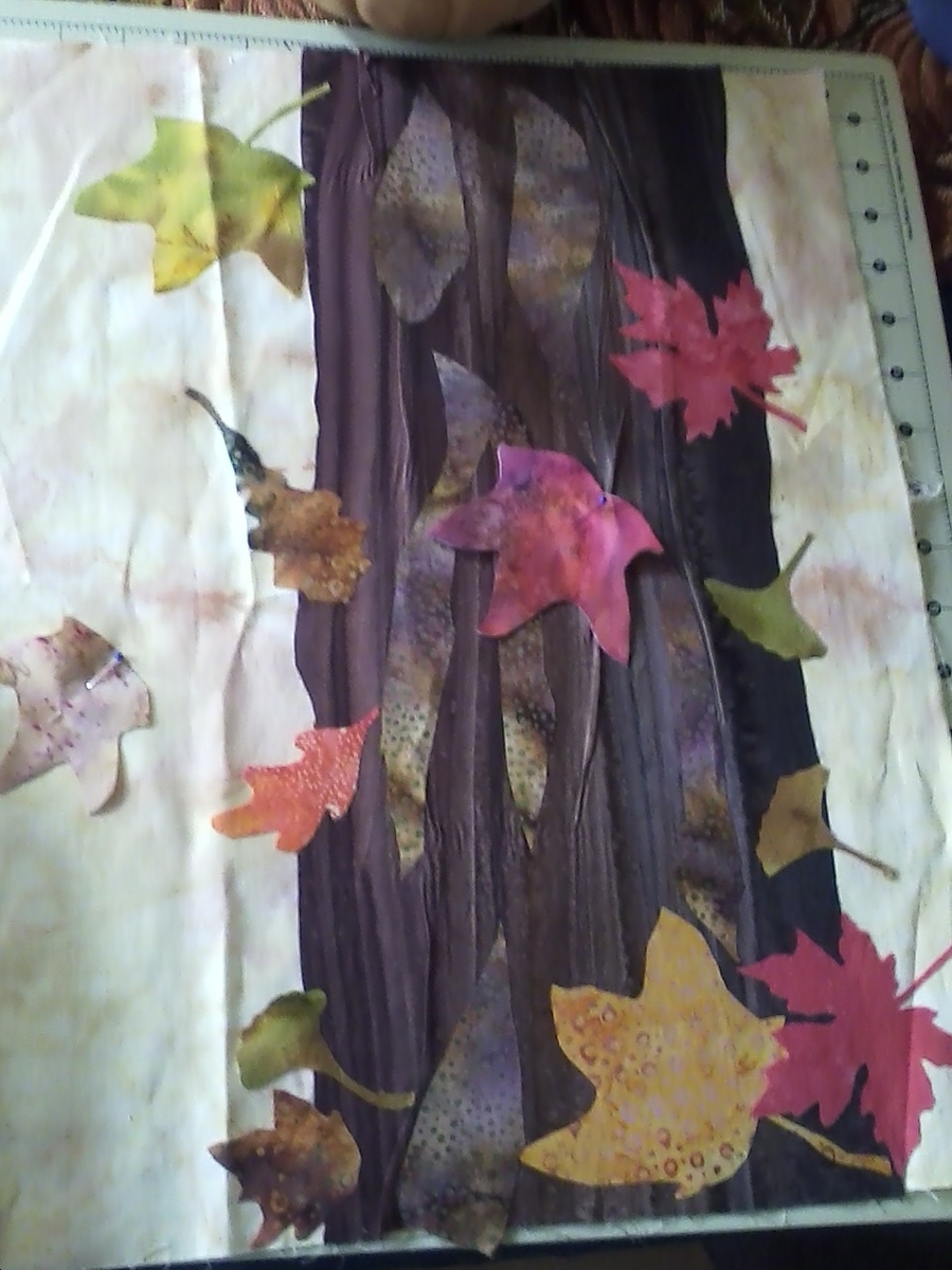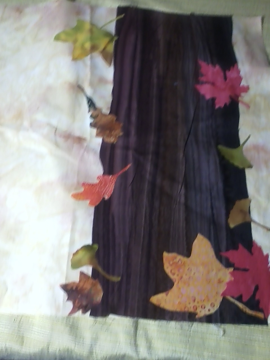 Is it supposed to be horizontal as in the picture? I am wondering if the upload turned the picture... Because the striations in the tree fabric sure do look like bark, I think they should go up and down to look more like a tree. When I look at it vertical, I can see more of the feeling of leaves falling. Then I'd add lots more pretty, brightly colored leaves (red, gold, purple, etc) scattered along and esp. at the bottom. Love the maple leaf shape and others that are more deeply cut than just a elongated pointy oval shape.
