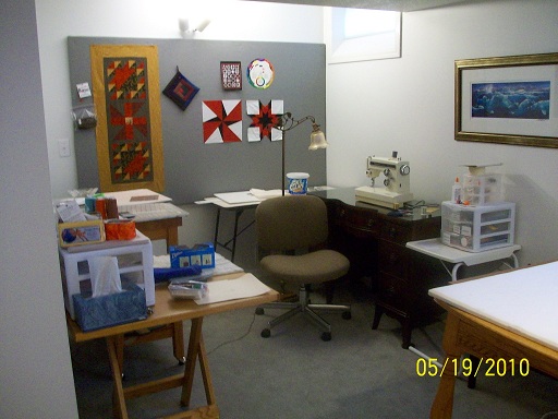 When I need a smaller design wall, or want to take one to a class I have this small one that is hinged in the middle with duct tape so that it is free-standing. I just pin flannel to the front side when I'm using it, but it would be better if I took the time to glue it in place!