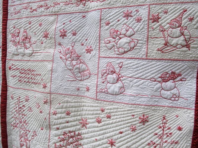Julia, you can use a very fine thread (Superior's So Fine brand or MasterPiece cotton) that matches the background and just stitch right over the embroidery. I have no idea how much detail you want to add, but here are a couple of samples of a different Crabapple Hill design that have fabulous quilting: