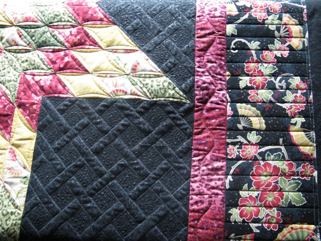 Karen, I don't know how much quilting you are planning to do, but a diagonal basket weave design with stippling behind the applique would be beautiful!
