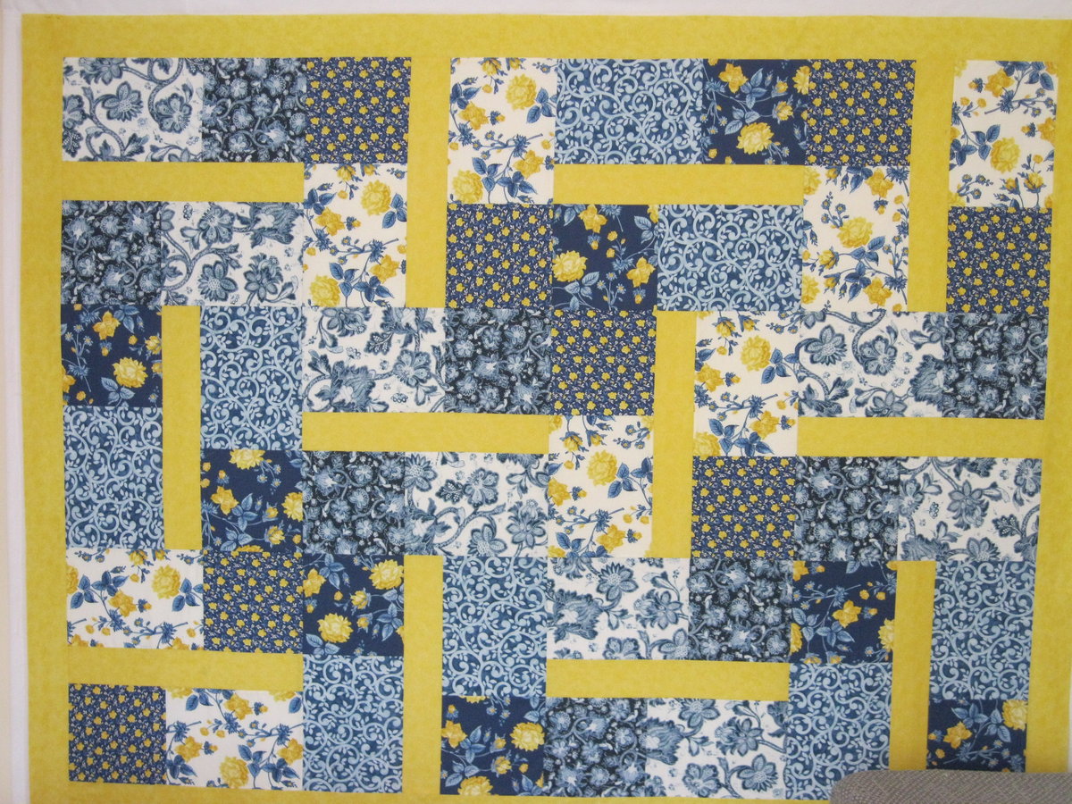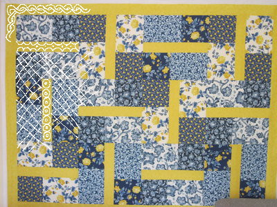 x 19" strips and then what because all the blocks are wonky sizes, there are squares and rectangles. This top is up on my design wall and having looked at it more I think I could cross hatch it because the patterns on the fabric are curvy, this would be lovely and quick and soothing after the trials and tribulations. Oh help? I know there aren't exactly rules but I just haven't got enough experience and only get in more of a muddle as I troll through my books and the internet. I do know I would dearly like to do something a bit simpler as in easy as I have already invested so much time in this one and my sister is wondering what on earth I am making! The outer border after the yellow will be 12 to 15 inches deep, I'm waiting for my sister to decide how much drop she wants. The thread I have is Superior Treasure Little Prince 570, a variegated blue. Ready to listen to any suggestions, thanks.