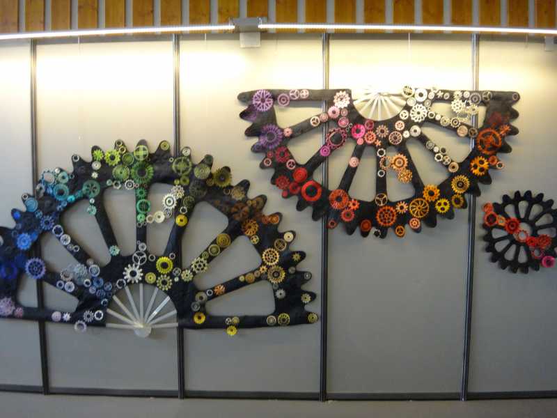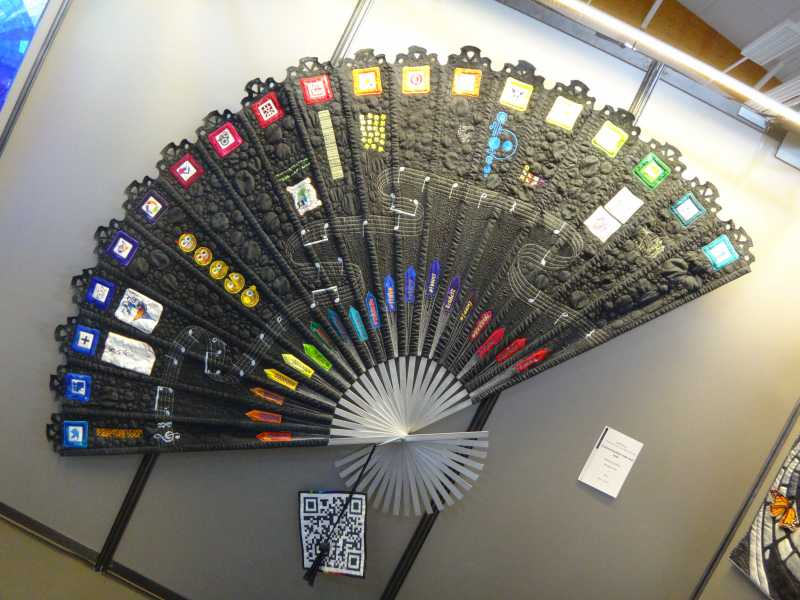 "Communication Then and Now" This is an amazing fan that touches on pretty much all forms of communication that you can think of. SHe uses quilting, embroidery, applique and ...you name it. THe little squares on the edge of the fan are all of the social media, you see the emoticons. also in here is braille, morse code, bar codes, messenger pigeon and it goes on and on.