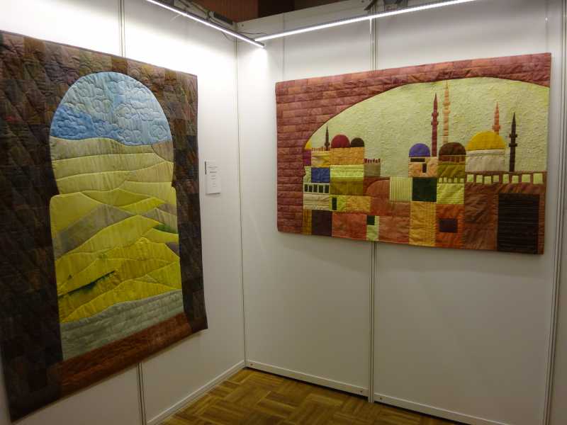 Grobenzeller Quiltgruppe focused on the Orient. Hues and patterns especially from richly illuminated architecture and brilliantly colored textiles, have inspired their latest quilts. Many of the geometric patterns are well know from traditional quilters. Oriental archways and doors served as inspiration and respect of the theme. Vintage and antique linens were dyes and then worked into quilts during a group project week.
