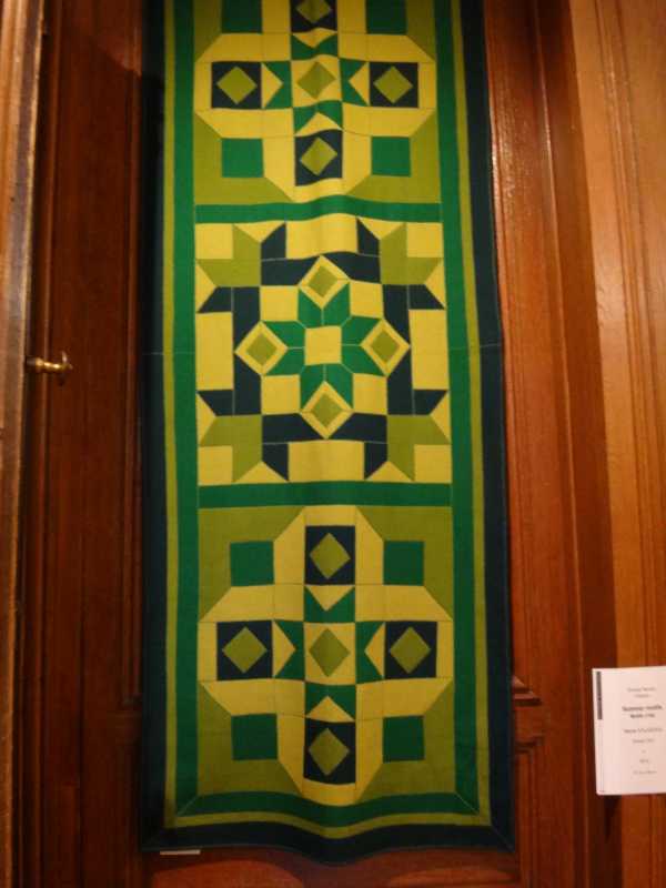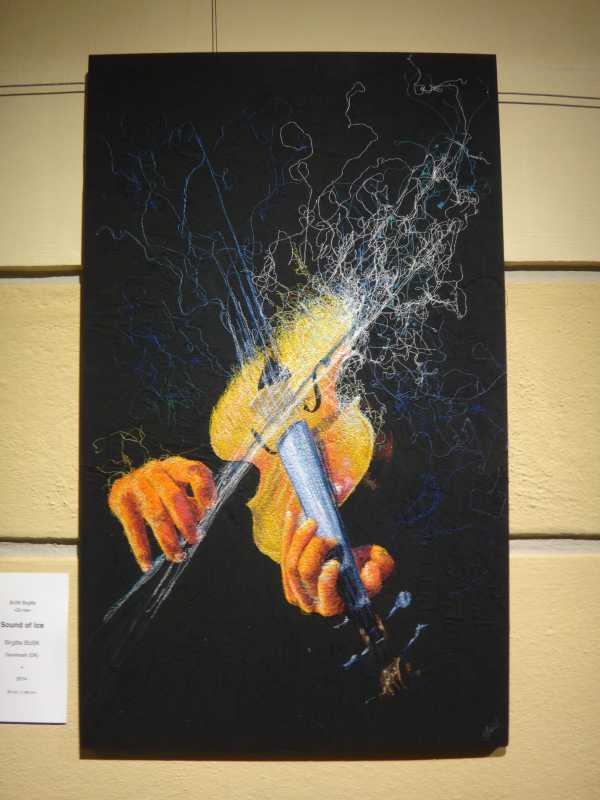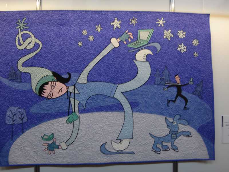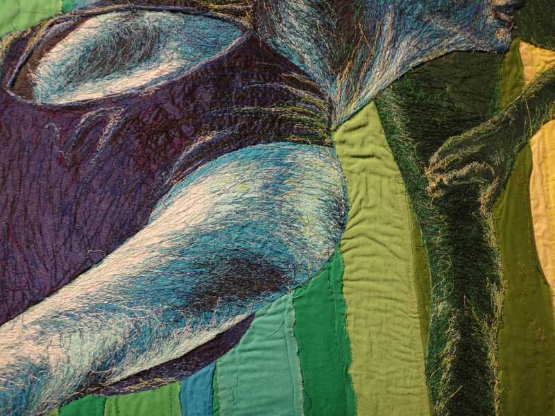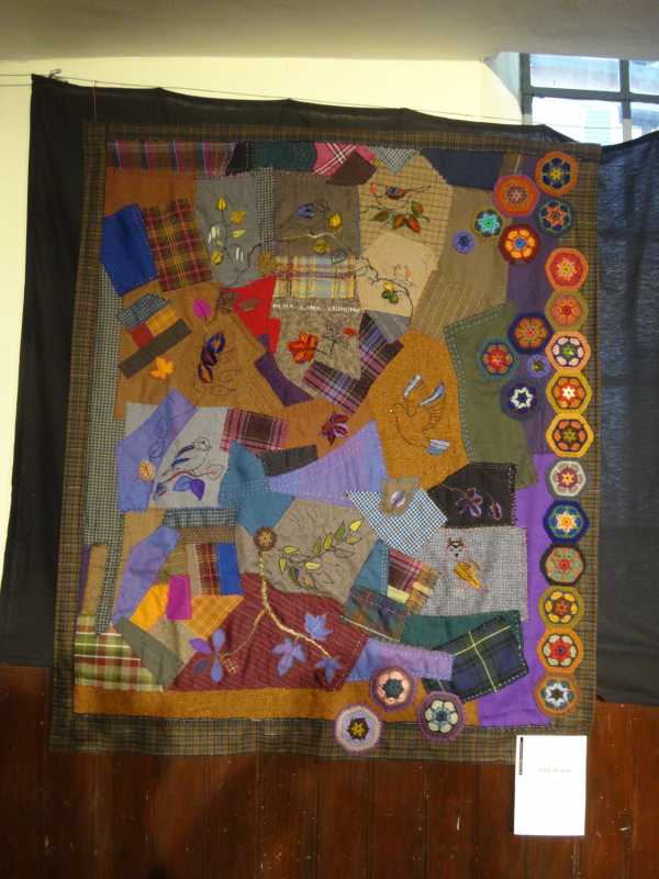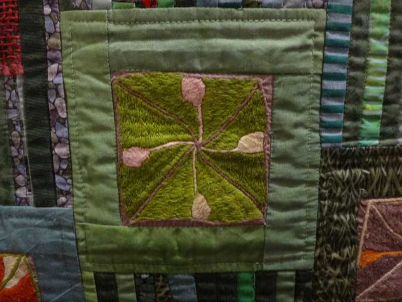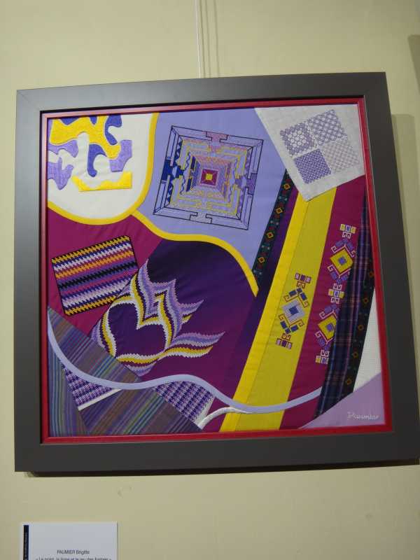 Also at this venue Brigitte Paumier (France) had an exhibit of her work called "The Dot, the line and the Play of Shapes". LOVED IT!! Brigitte stages her textile writing and creates her abstract works by juggling with all kinds of dots and lines. She cuts fabrics free-hand, tears her photos up and sews them, (I don't have any pictures of the ones with photos in them), uses her sewing machine like a paintbrush and her threads like color paints. The drawing of a line made of successive points creates movement on the fabric and gives her patterns sparkle and life with a strong and stirring spontaneity.