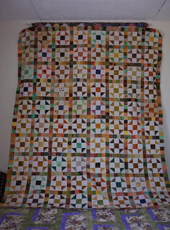 Details on this pattern: I had oodles of 2 1/2" cut triangles, sorted them into color groups. I also had many 2 1?2 and 2" strips. The project started as 6" Hole in the Barn Door" or "Churn Dash" blocks, whatever name you know this block as. Then I cut the 2" strips into squares and sashed with that. Then I sewed and sewed until I ran out of blocks.