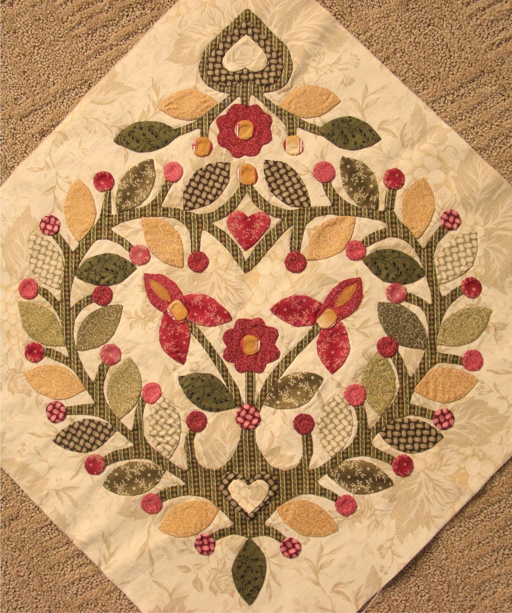 I have my vine done and I'm 2/3rds done with the leaves. I'm doing hand applique and I haven't had a lot of spare time lately. Only an hour or so at night after work. I'll get further this weekend, I hope. I can't wait to post my picture, too!