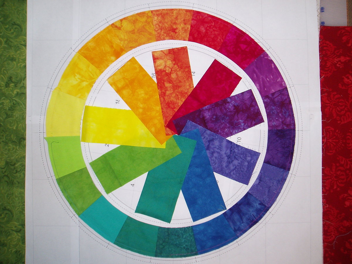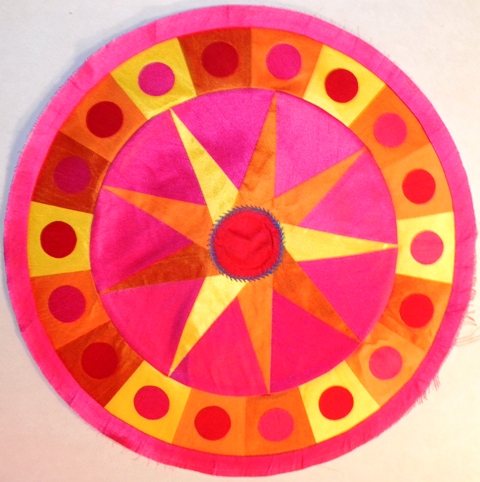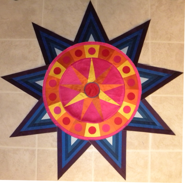 I just had to share what I've decided to do with my Sedona Star. I am still playing with it, and have gone as far as I can until I buy 8 yards (I think) of black for all of my background. So far, this is all from my stash, and all hand dyes that I have purchased over the years. I do not have the yellows that I need, so the yellow star point is a stand-in, and my ring is not sewn closed, because that may not be the right yellow. Also, the last border of each star point will be black, and therefore the star points are incomplete, too. Lots of fun, so far!