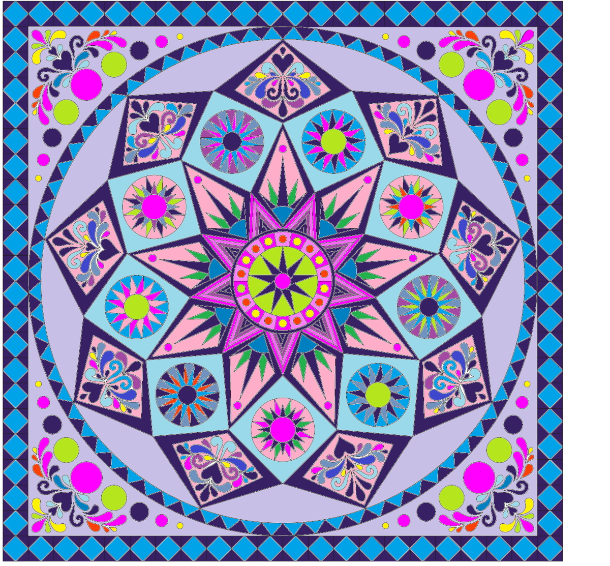 This is going to be exciting--to see the pieced quilt before it is even cut! I'm new to quilting with only three small pieces under my belt (a pieced throw, a round robin with my Mom and sisters and an applique wall hanging) and never owned a sewing machine until last year. So much to learn, therefore, being able to put Sedona Star into Corel Draw and make some trial-and-error choices on fabrics up front is great. I'm looking forward to this journey together and to all I'm going to learn from everybody who participates in the process. I'm a late starter because I spent 30 years in the Navy and quilting was just not part of my vocabulary. My sister, a 30-year quilter and Gold Star Charter member of TQS, saw an opportunity and with a gleam in her eye, sat me down in her studio for a week, taught me all the basics, made me practice a lot, made me do a nine-patch sampler from start to finish, proper cutting, piecing, miters, borders, stitch-in-the ditch, binding... and then signed me up for a complimentary 6-month membership to The Quilt Show. More recently, when I visit her, she encourages me to doodle om her mid-arm... what is she thinking now?